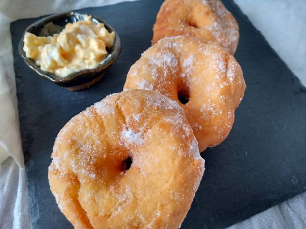 あつあつのうちにお砂糖をかけていただきます!今回はたまごサラダを添えてみました。ゆで卵をナイフで刻み、マヨネーズとクレイジーソルトで味付けたものです。ハワイの揚げドーナッツマラサダをイメージしたのですが、こんなメニューがあったような。甘いとしょっぱいがなかなか良い組み合わせでした。