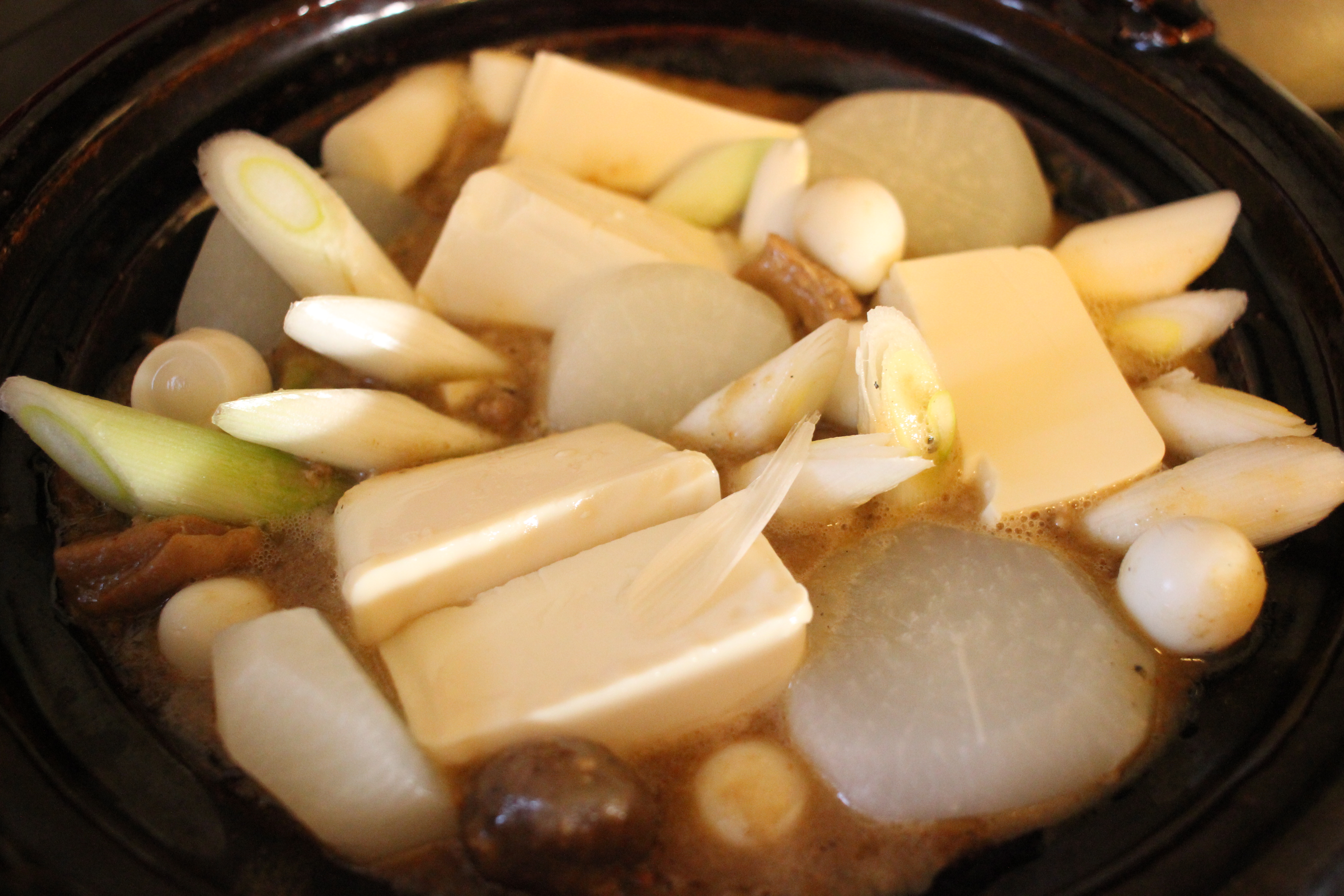 温めたもつ煮パックにネギ・とうふ・うずらの卵・ゆでた大根を入れます。温まったら出来上がりです。ポイントはご飯を山盛りにすることです。これで永井食堂やたま家食堂みたいなもつ煮定食になりますね。
