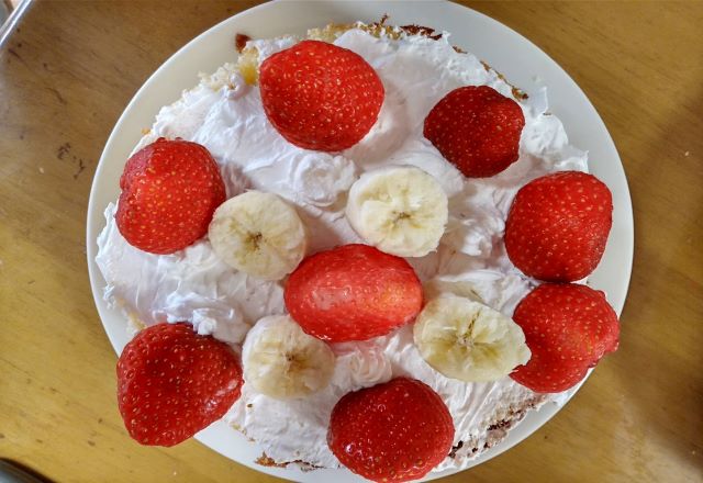お手軽ホイップクリームをきゅきゅっとこどもが絞って上に苺をのせてみた。バナナは手でちぎる。なんて気楽なホールケーキなんだろう。