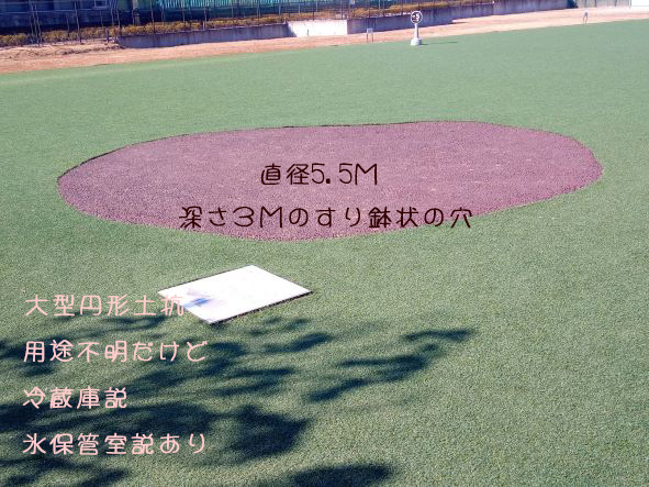 ひろいグリーンの上にバンカーみたいな穴がありました。これも昔の貴重な遺跡を表現しているそうです。このような穴にいろいろなものを保管していたと考えられているそうです。
