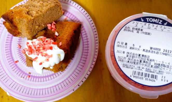 TOMIZのフリーズドライのいちごがかわいくてチョコレートシフォンに合いそうだったので買ってみました。ふわっと香る苺がさわやかでした。