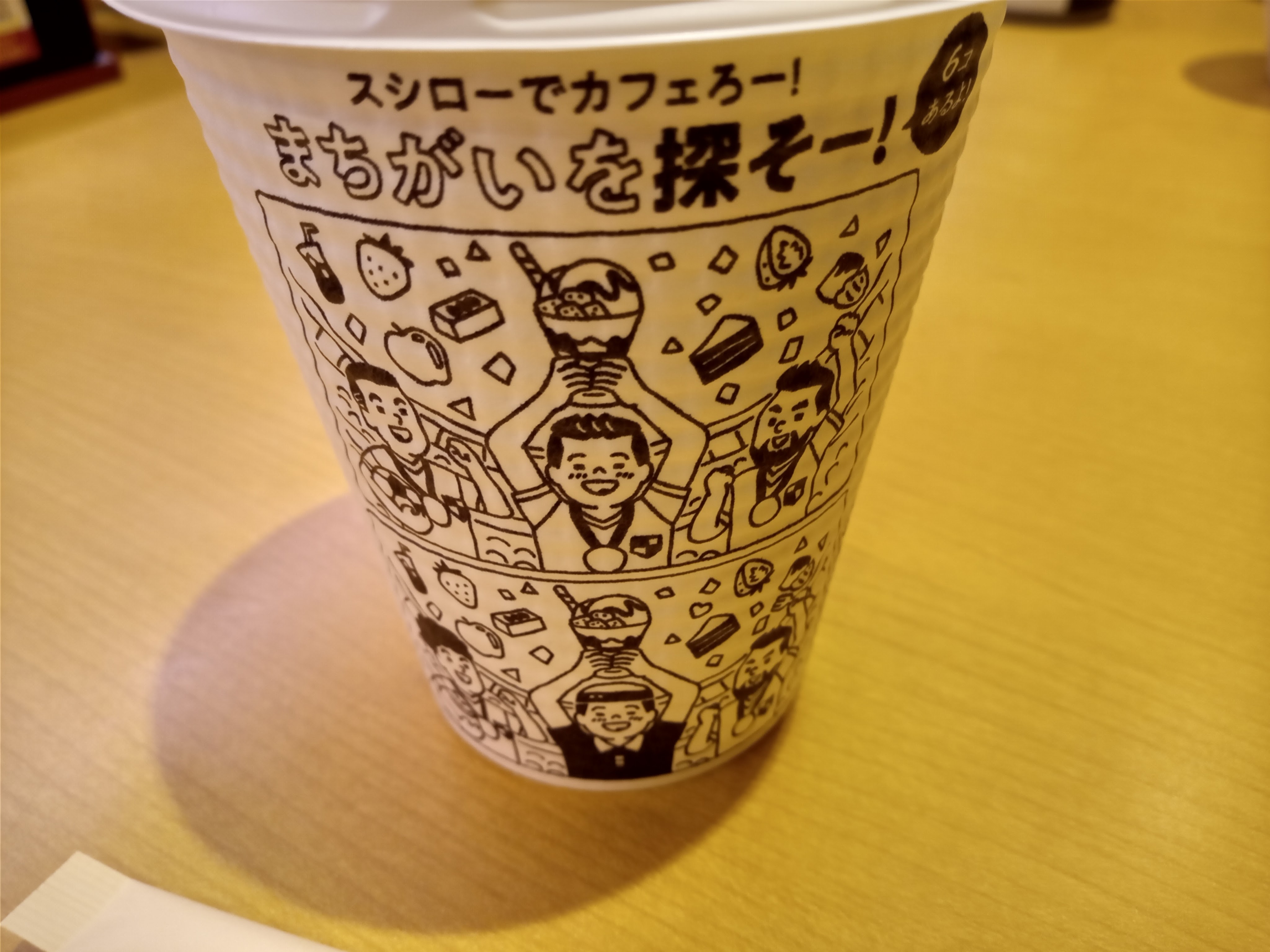 カップには『間違い探し』がプリントされていた。私のように子供がお寿司を食べている間にお茶をし『間違い探し』で暇をつぶしている親御さんは多いのだろう…。