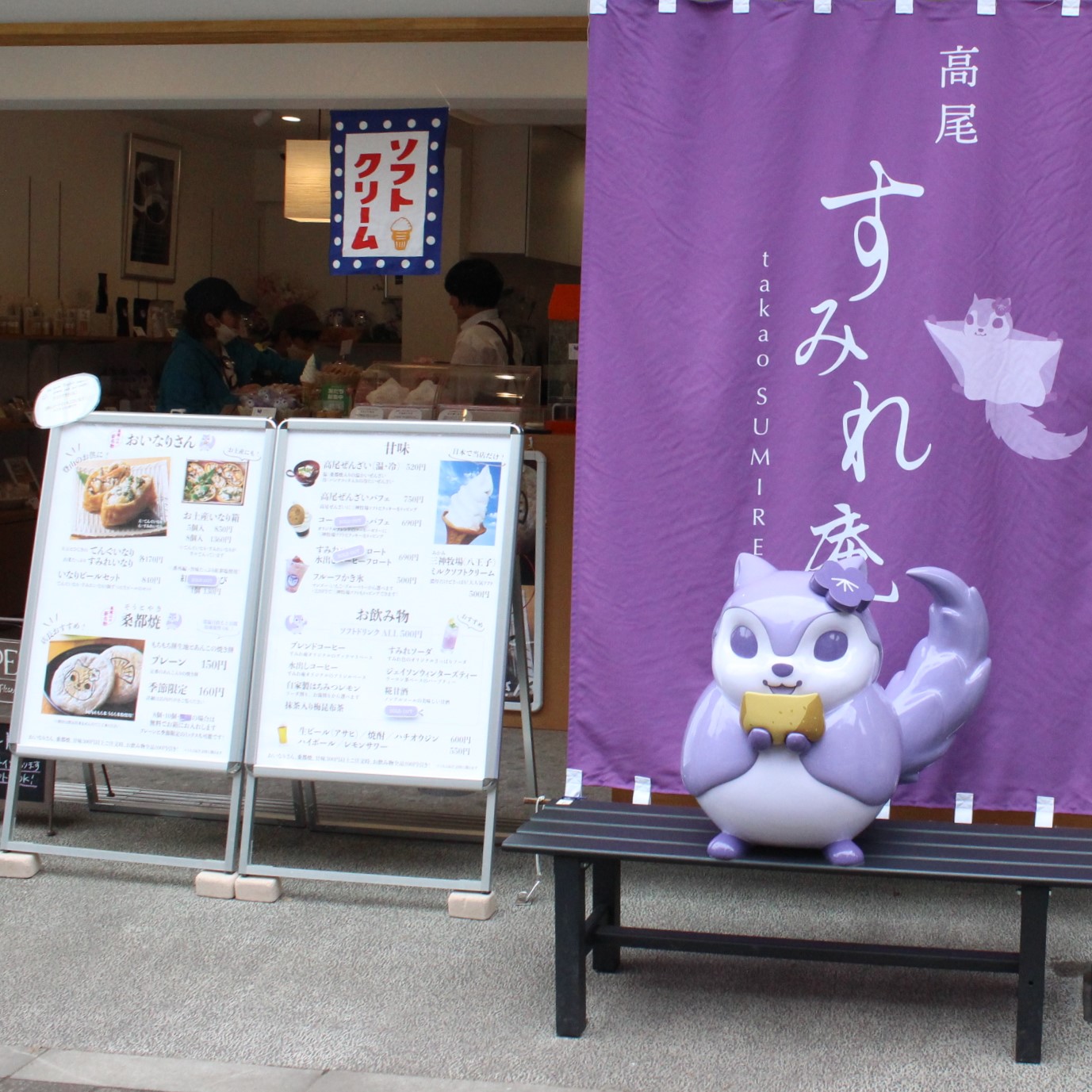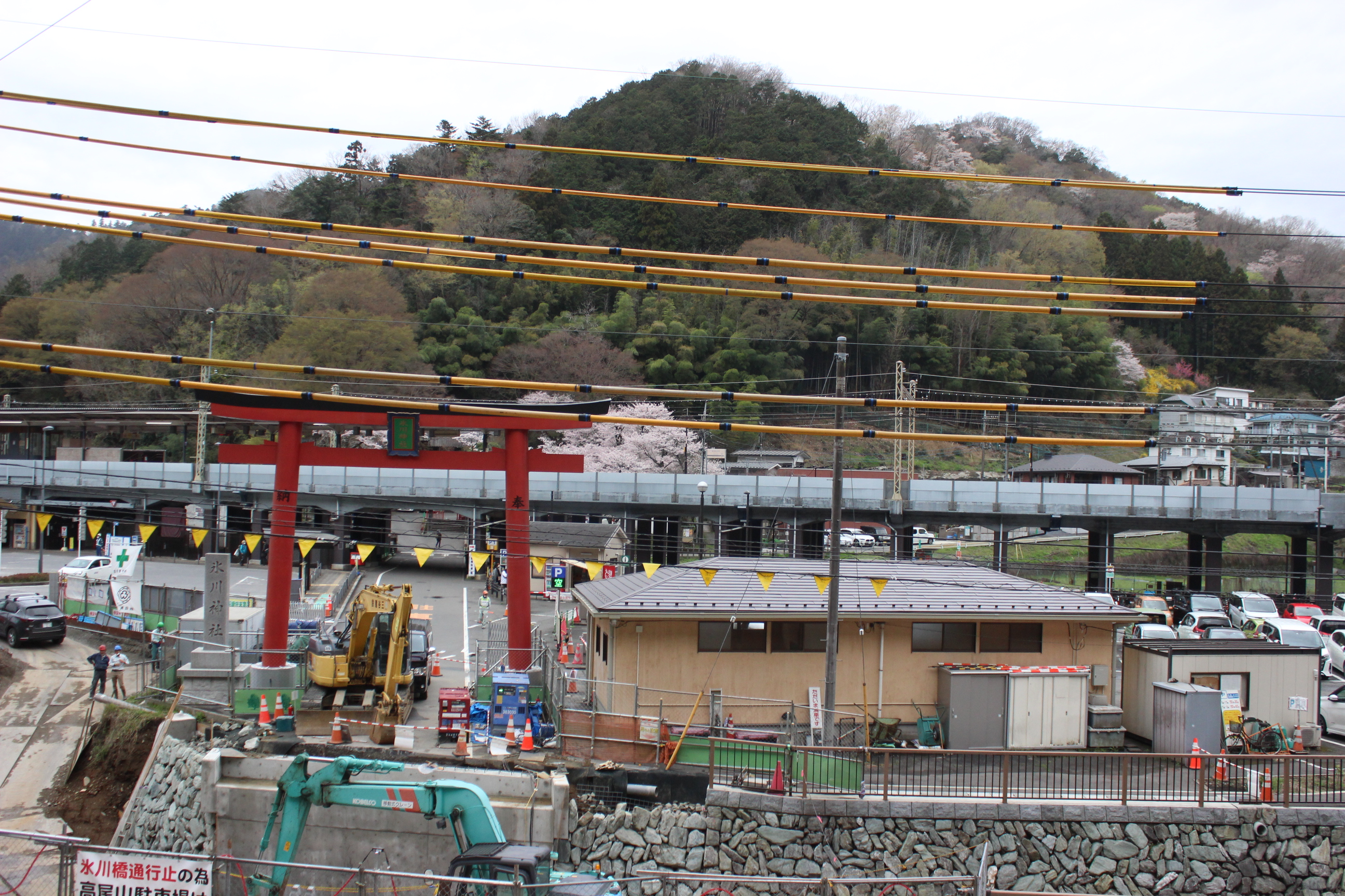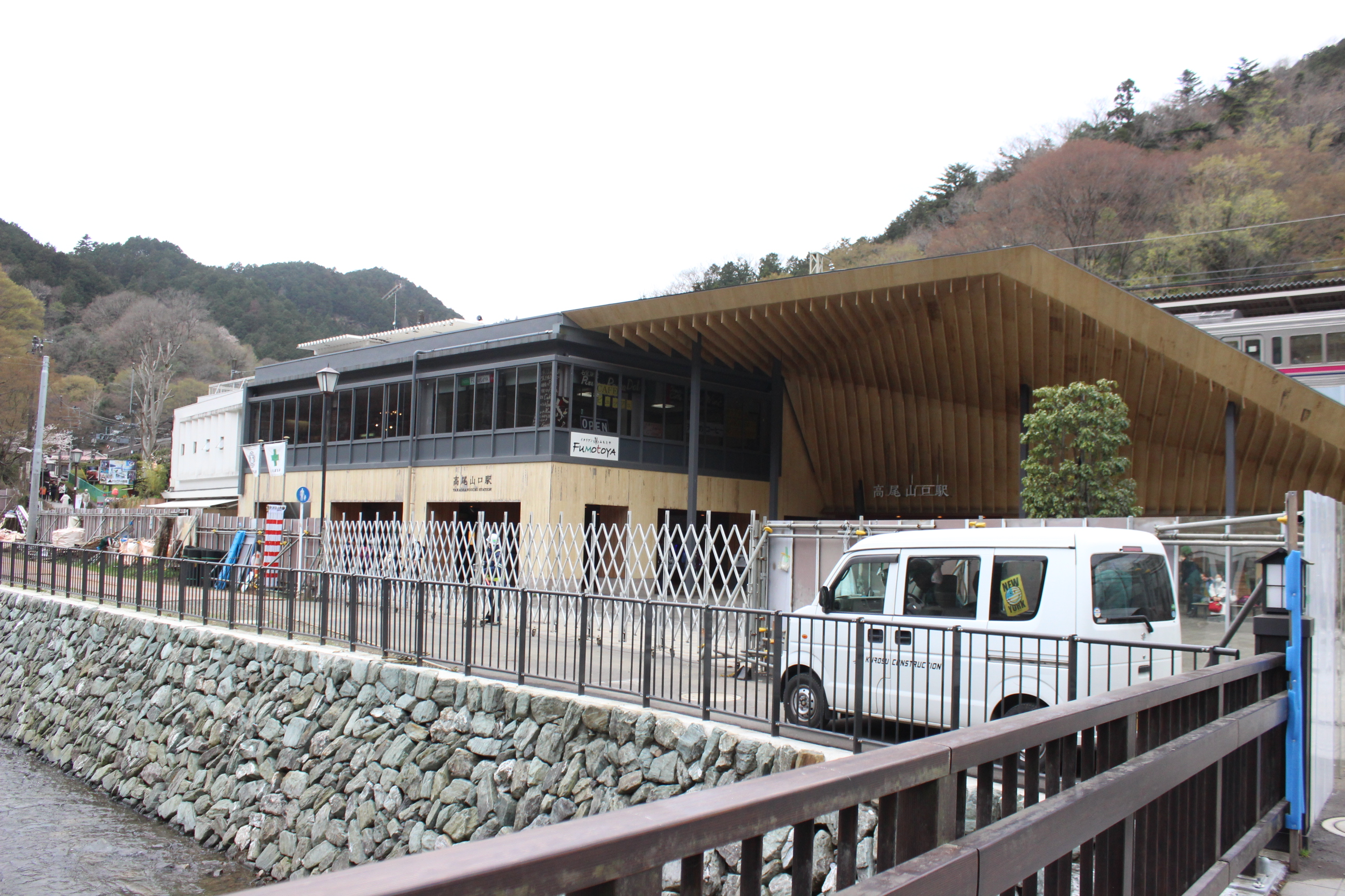 桜の季節にくる高尾山口駅。駅前は古き良きお店と新しいお店が共存しています。