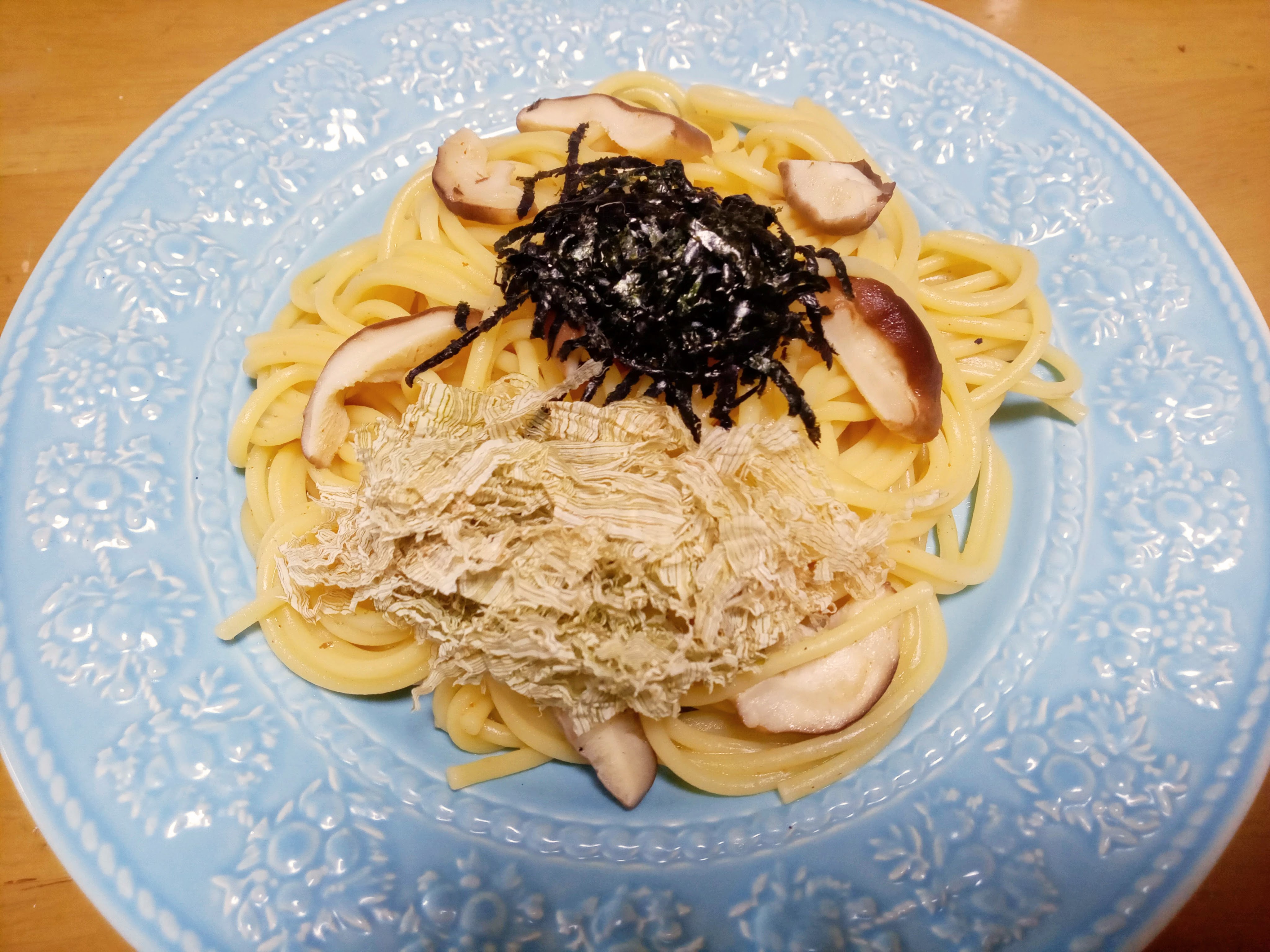 がごめ昆布の削りを載せて、冷凍していた自家製しいたけとバターで和えたパスタにうに醬油を混ぜて頂きました!