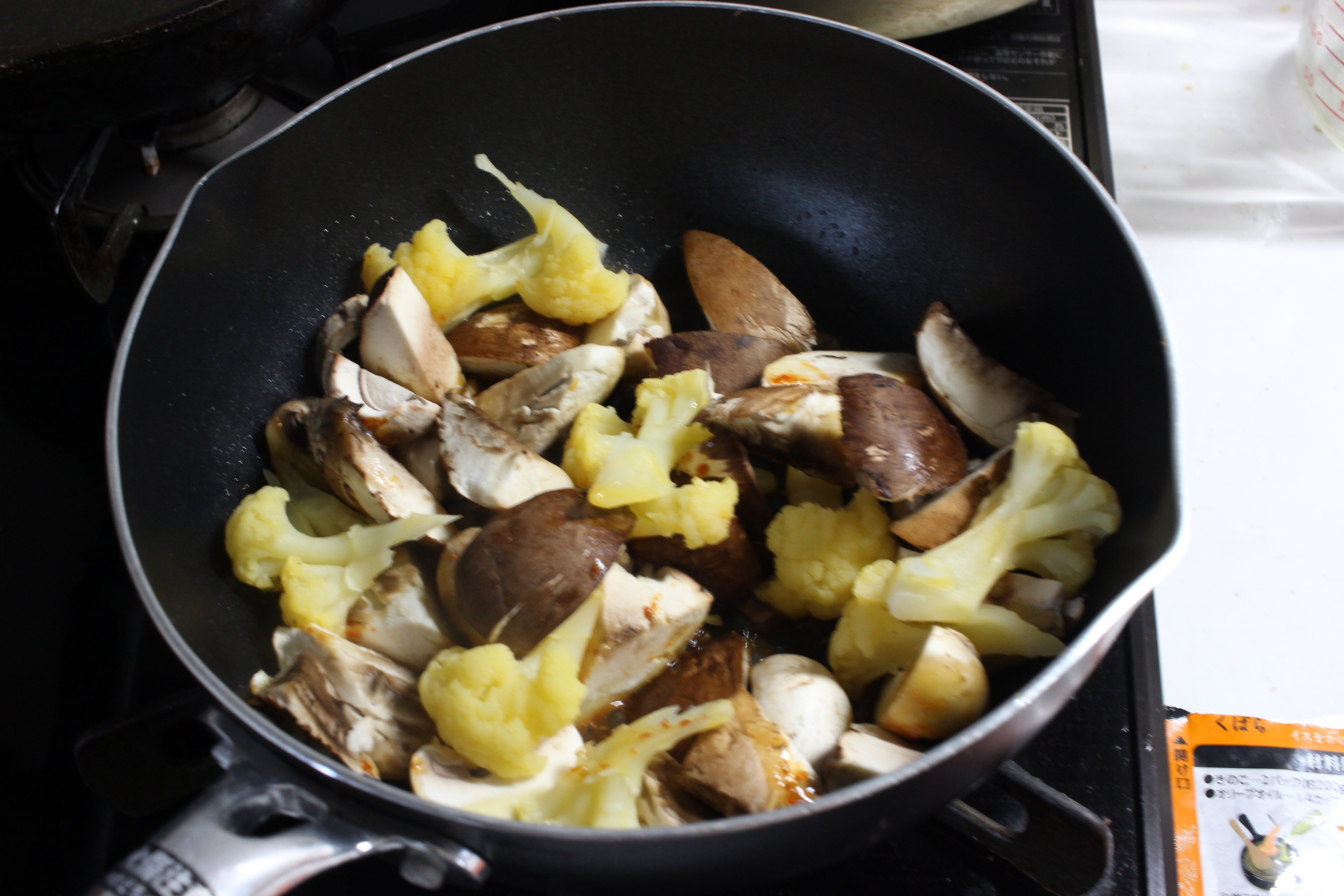きのこ200g(カリフラワーも入れました)を加えてぐつぐつしたら7分間弱火で加熱するだけです。