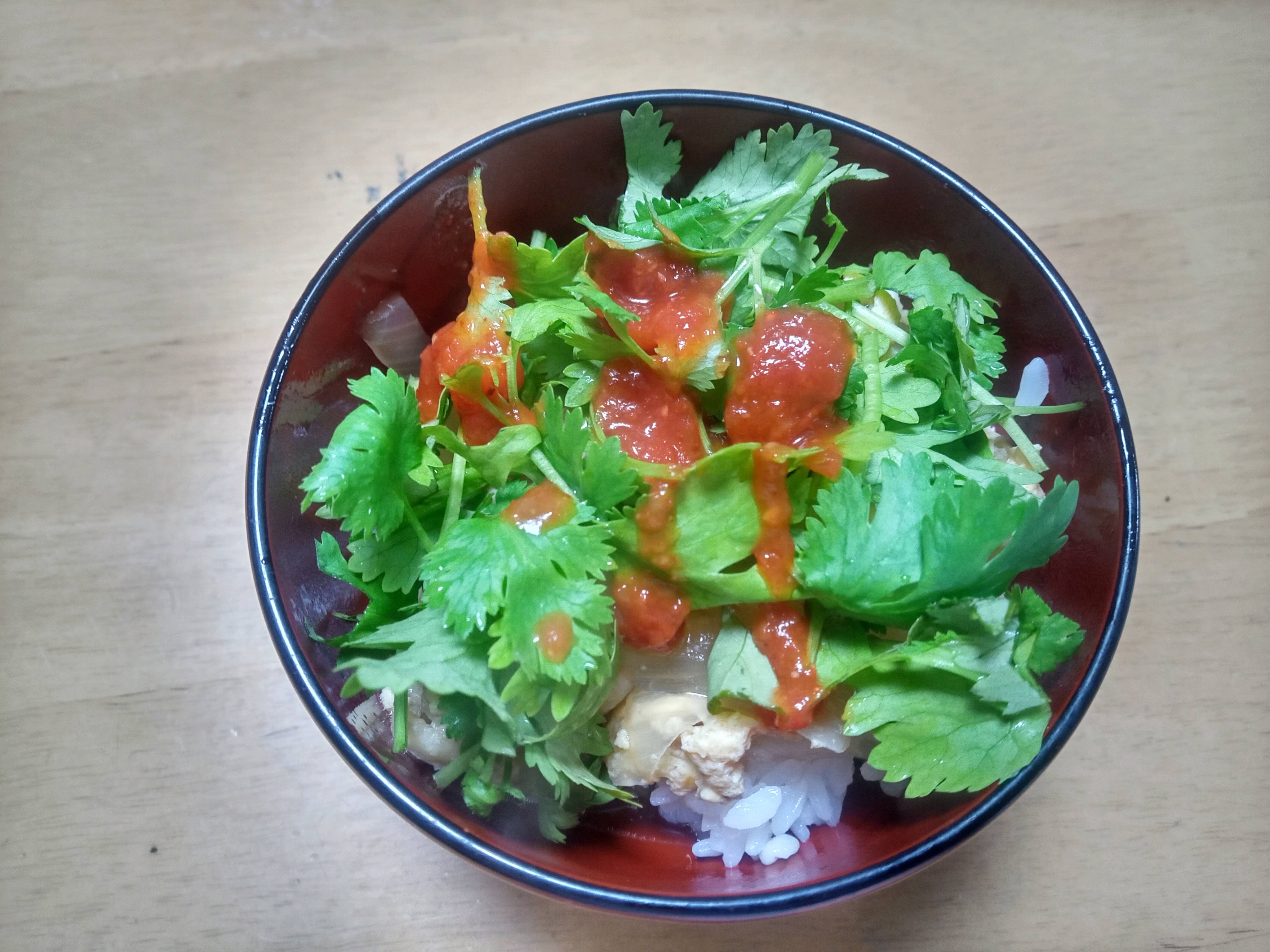 三つ葉と家にあったパクチーをのせてみたところ・・・・