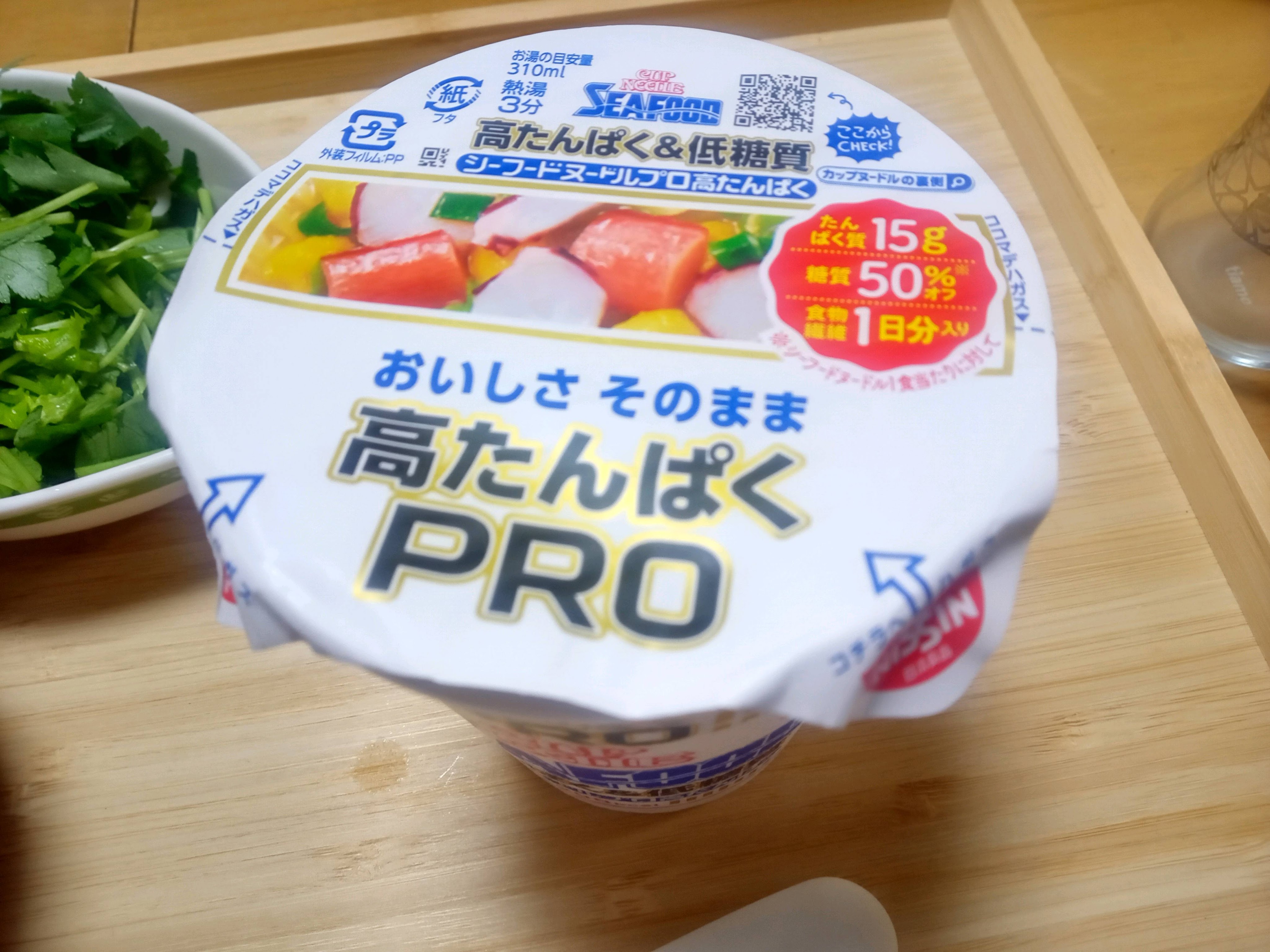 夕方のドンキで見つけた高たんぱくのシーフードカップヌードルは1個199円(税抜き)と他のカップヌードルに比べて割高でしたが、気がつくとカゴに入れていました。