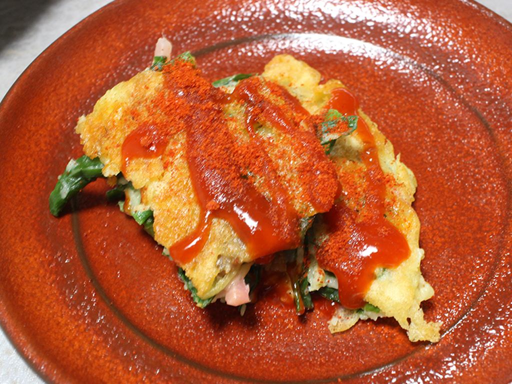 お好み焼き粉と卵と水で生地を作り、ニラと紅生姜、チーズをたっぷり入れました。豚小間も少々入れます。