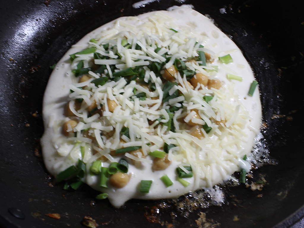 フライパンに薄くのばしたら、ひよこ豆とねぎ、チーズをたっぷりのせます。