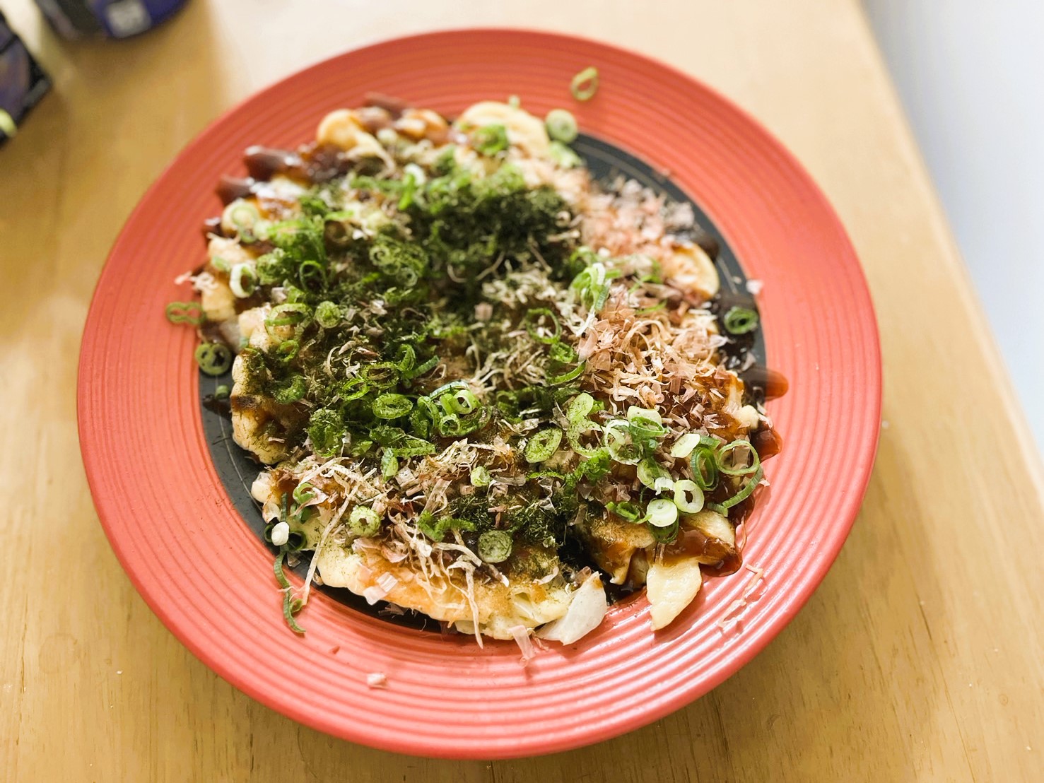 私はお昼にお好み焼きをフライパンで焼いてみました