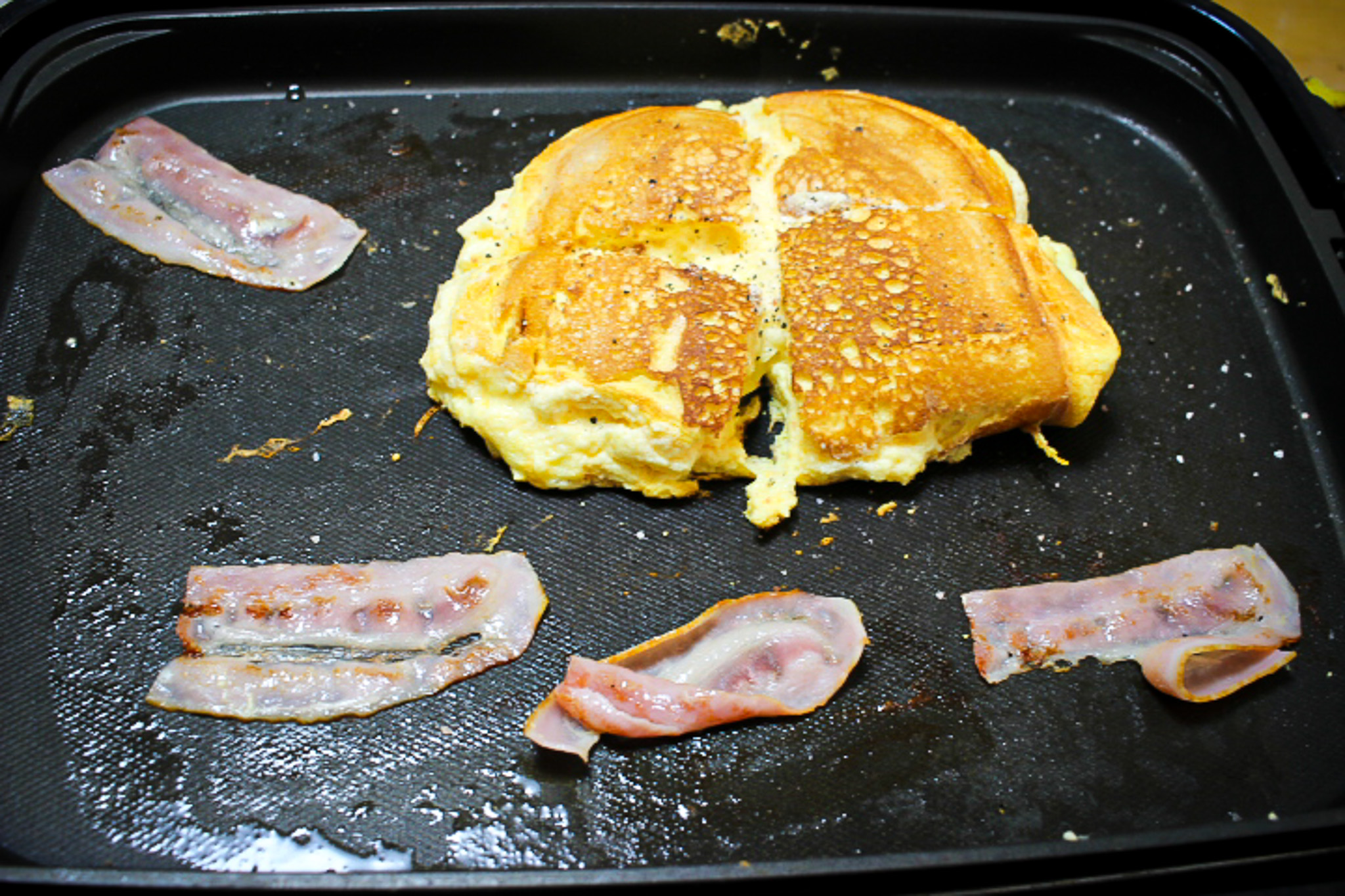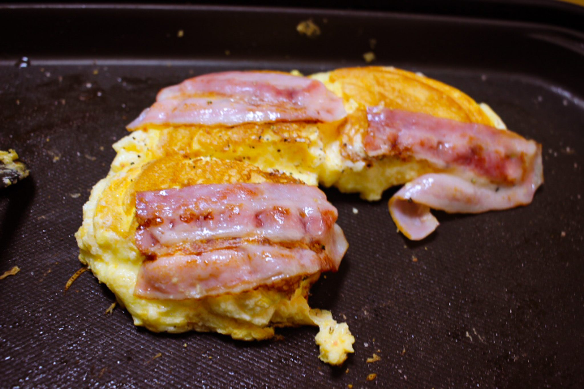 お好み焼きにも見えなくもないですがちょっと寂しいのでベーコンも焼いてみます