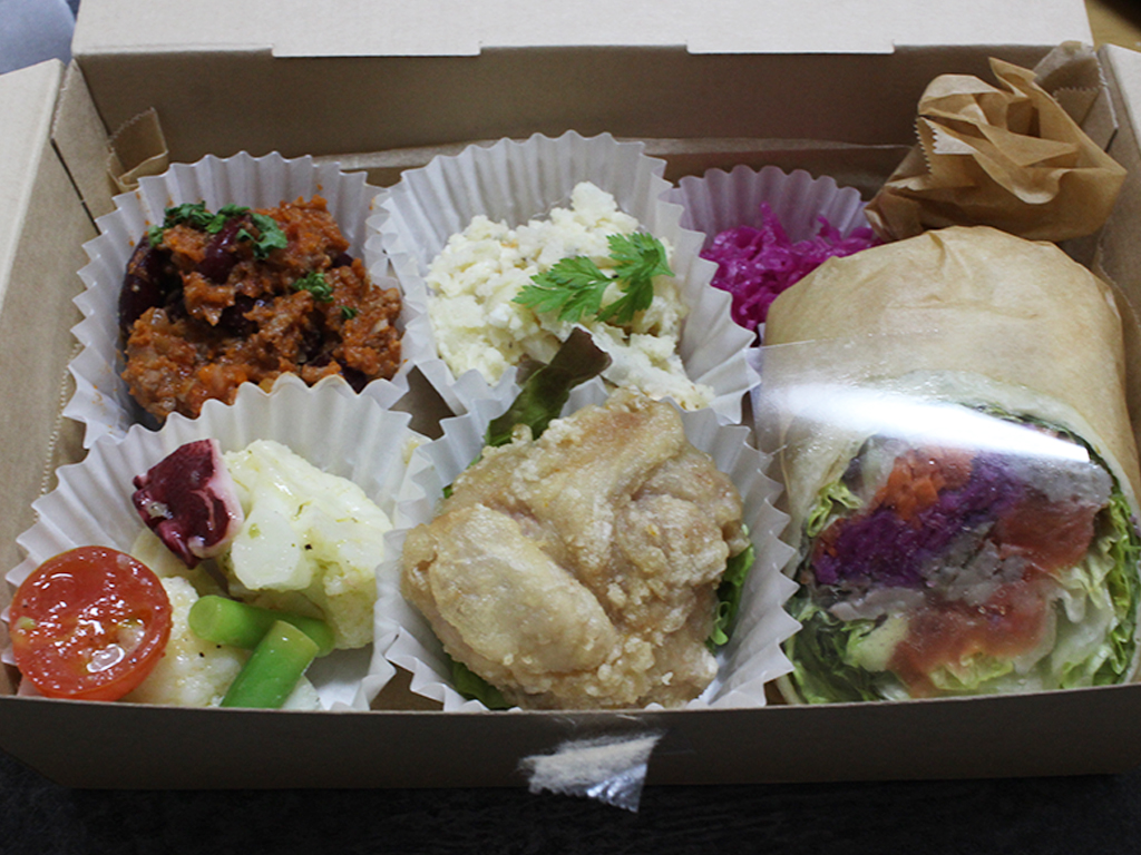 お弁当を注文して追加料金を支払うと大盛にしてくれます!おかずは目の前に並んだ数種類のお惣菜からチョイスでき、たっぷりと入れてくれます。