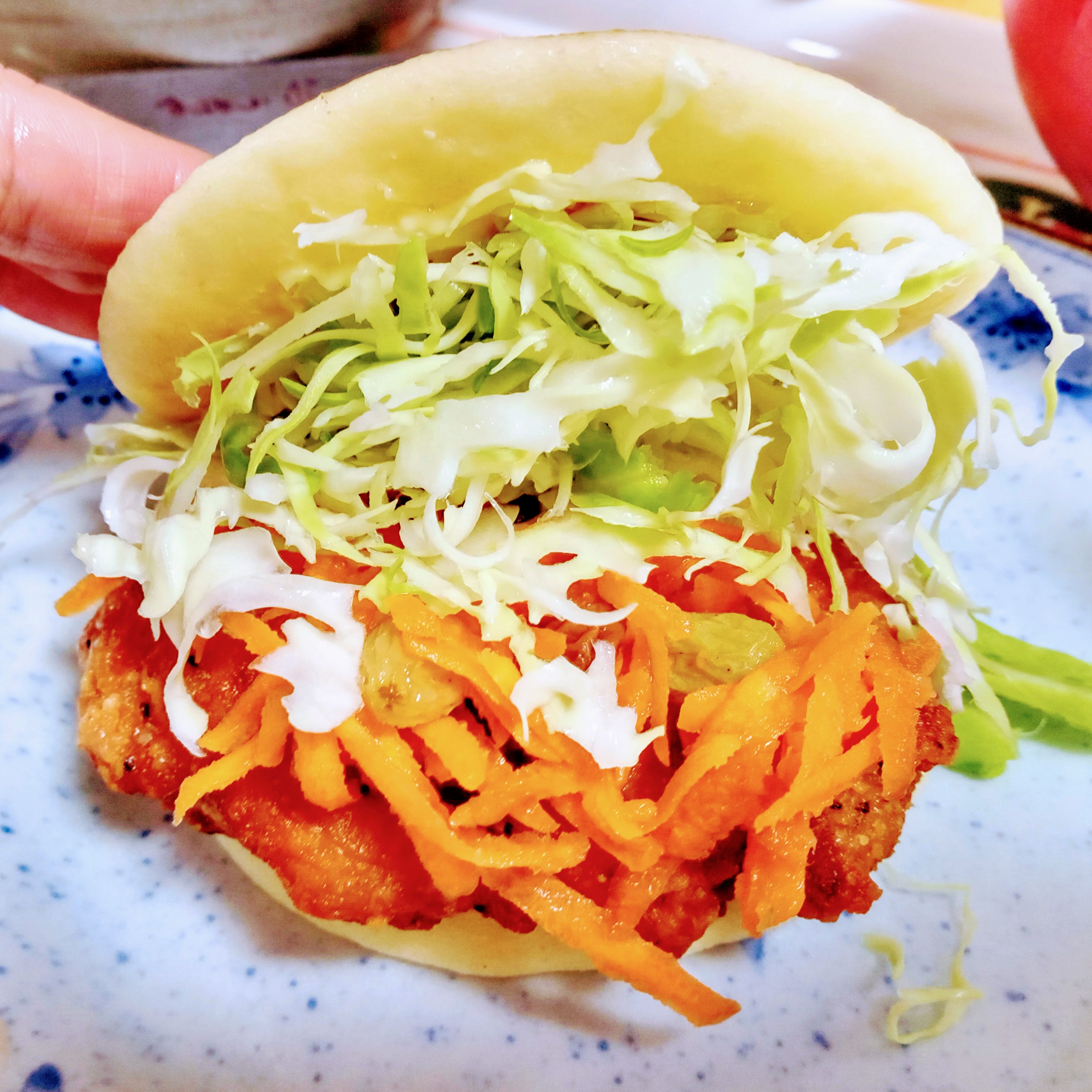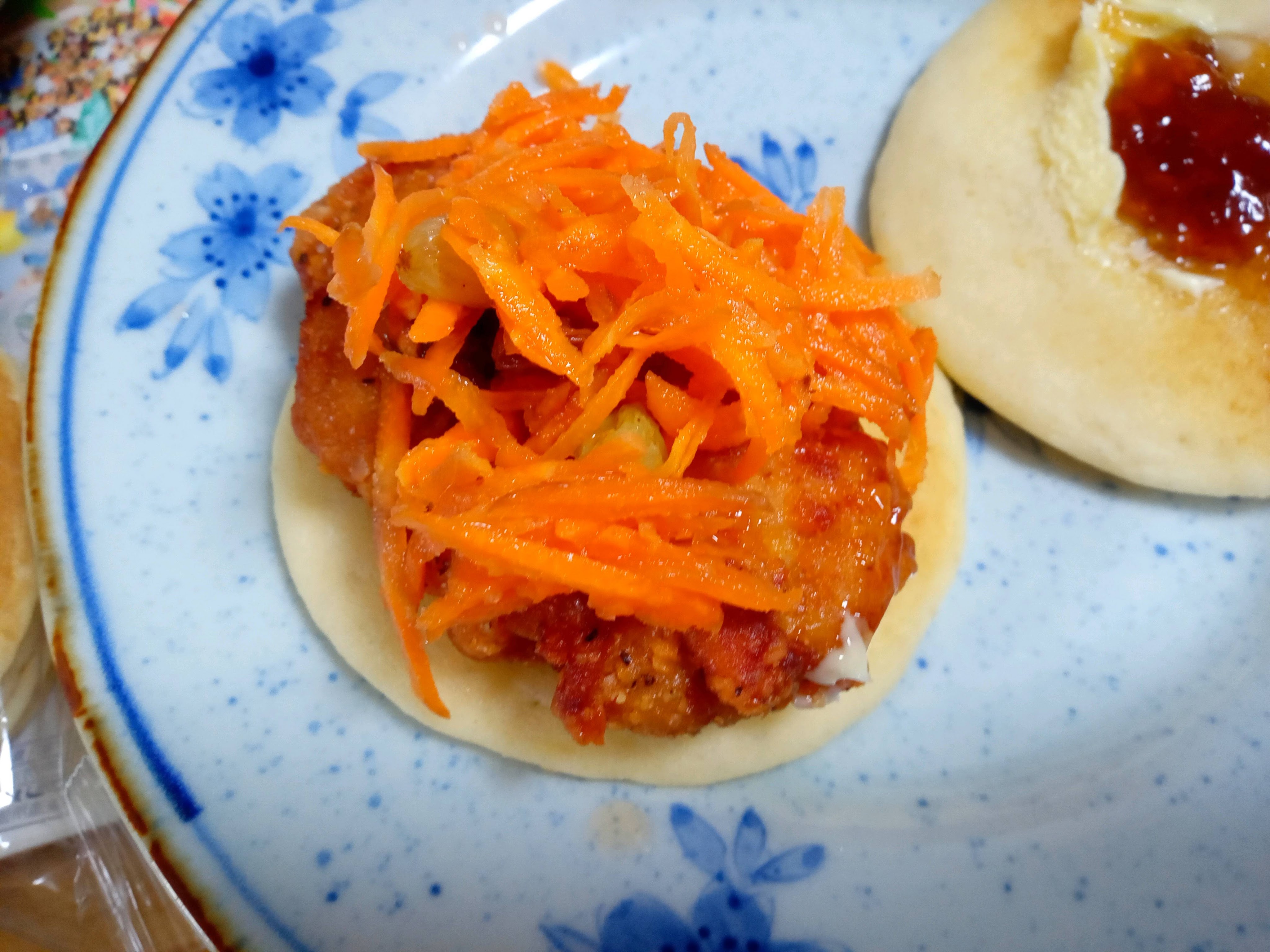 このパンケーキにナナチキを挟むだけなのですが、家にあったキャベツとキャロットラぺも挟んでみました。